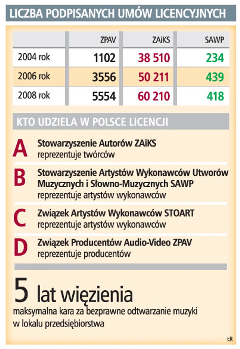 – My nikogo nie zmuszamy do podpisywania umów, zastraszając listami. Jeśli ktoś odtwarza utwory, które są chronione przez ZAiKS, to oczywiście dochodzimy swoich praw. Zasada jest taka, że najpierw uświadamiamy przedsiębiorców, m.in. co do tego, jakie prawa przysługują twórcom – twierdzi Damian Popiela ze Stowarzyszenia Autorów ZAiKS. Zarzutami rzecznika są zdziwieni także przedstawiciele Związku Producentów Audio-Video.