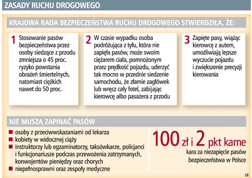 Dziś Trybunał Konstytucyjny zdecyduje, czy nadal będzie obowiązkowa jazda samochodem z zapiętymi pasami. Zdaniem skarżących obowiązek zapinania pasów narusza wolność i prywatność obywateli. Zapinanie pasów ma chronić życie i zdrowie uczestników ruchu drogowego, uważają prawnicy.
