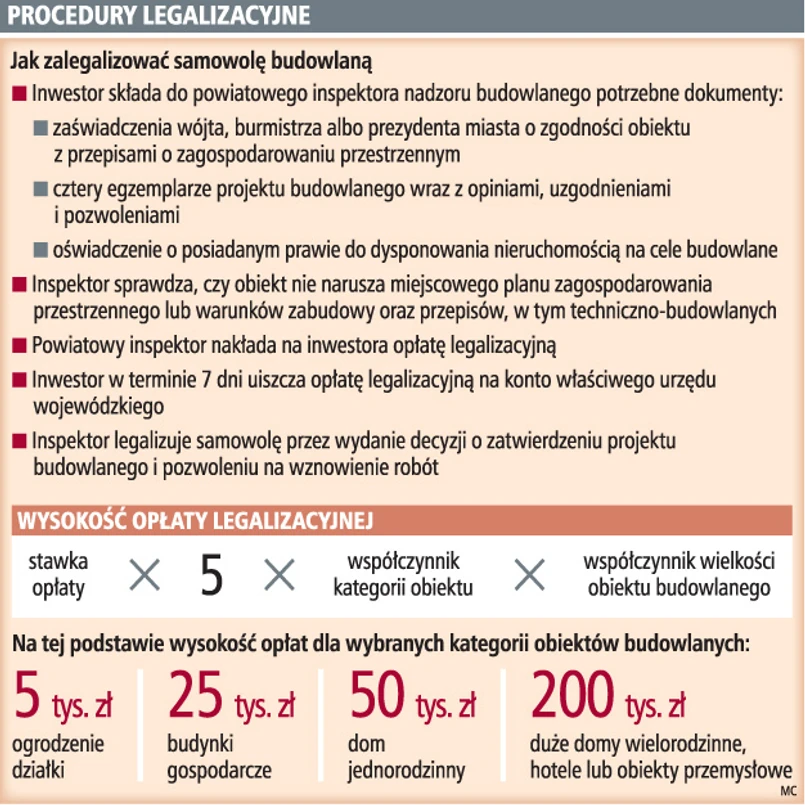 Przepisy o legalizacji samowoli budowlanych, wbrew intencjom ustawodawcy, odgrywają coraz mniejszą rolę. Blokadą dla inwestorów są wygórowane opłaty legalizacyjne. Na przykład za legalizację domu jednorodzinnego trzeba zapłacić 50 tys. zł, a garażu 25 tys. zł. Dla właścicieli takich obiektów kary te są za wysokie. Są oni więc zmuszeni do rozbierania swoich budynków. Taka jest bowiem konsekwencja niezapłacenia opłaty legalizacyjnej w terminie.