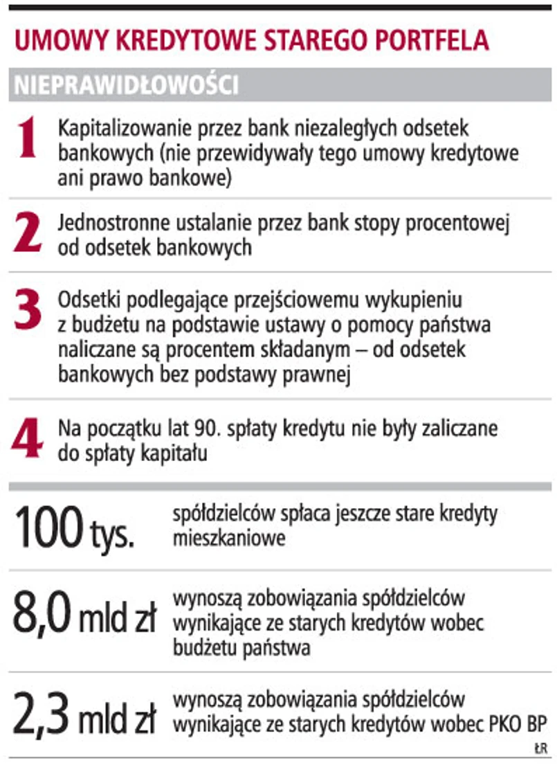 Ponad 100 tys. spółdzielców spłaca jeszcze stare kredyty mieszkaniowe zaciągnięte na początku lat 90. Z powodu inflacji ich oprocentowanie jest często kilka razy wyższe niż pożyczony kapitał. Dziesięcioletni okres regularnej spłaty będzie uzasadniał umorzenie niespłaconego 20-letniego długu.