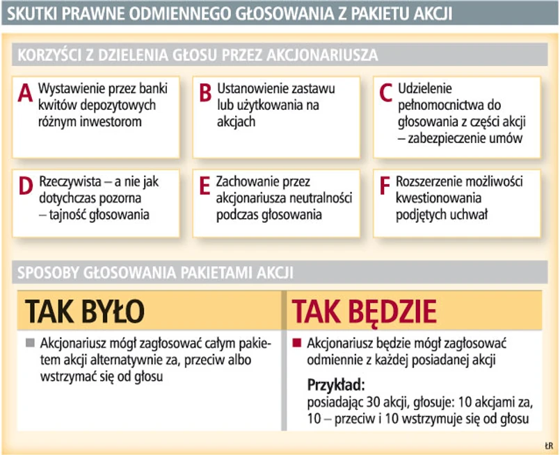 Do tej pory przepisy nie określały, czy posiadacz kilku akcji może głosować odmiennie z każdej z nich. Prawnicy uważali że nie jest to dopuszczalne.