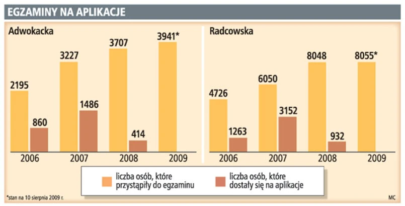 Absolwenci wydziałów prawniczych, którzy zdecydowali się w tym roku zdawać egzamin na aplikacje adwokacką, radcowską lub notarialną będą mieli więcej konkurentów. Jak podają komisje kwalifikacyjne, osób, które złożyły dokumenty w tym roku, już jest więcej niż we wcześniejszych latach, a zgłoszenia wciąż napływają pocztą. Ostatni dzień składania zgłoszeń upłynął 5 sierpnia 2009 r. Dla dokumentów wysyłanych pocztą liczy się data stempla pocztowego.