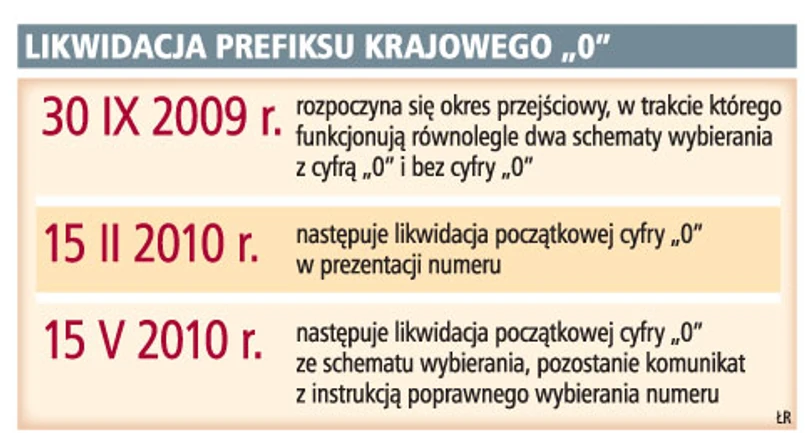 Obecnie, dzwoniąc do innego miasta, wybieramy cyfrę zero i numer kierunkowy lub zero, numer dostawcy usługi i dopiero numer kierunkowy. Od 30 września, jeżeli wybierzemy numer w ten sposób, to w słuchawce przez pierwsze kilkanaście miesięcy usłyszymy komunikat o zmianie numeracji, ale połączenie uzyskamy. Jak informuje Urząd Komunikacji Elektronicznej, komunikat ten nie będzie odtwarzany przy każdym wybraniu numeru w ten sposób. Jednak od 15 maja 2010 r. abonent, który przed numerem kierunkowym wybierze zero, nie uzyska połączenia. Dlatego, im bliżej tej daty, komunikat z informacją o zmianie numeracji będzie coraz częściej słyszany w słuchawce telefonu. Zniknie on dopiero 15 stycznia 2011 r.
