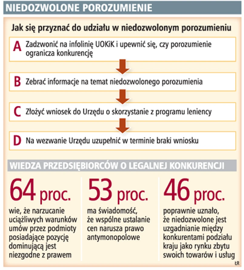 Przedsiębiorca, który chce dobrowolnie przyznać się do udziału w porozumieniu naruszającym konkurencję, może skorzystać z tzw. programu leniency. Program ten pozwala na odstąpienie przez UOKiK od nałożenia sankcji finansowej lub jej obniżenie, jeżeli przedsiębiorca podjął współpracę z urzędem antymonopolowym oraz przedstawił dowody na istnienie niedozwolonego porozumienia ograniczającego konkurencję.