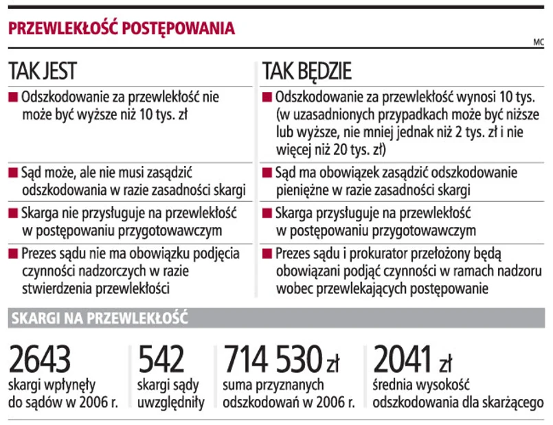 Na skutek zasadnej skargi na przewlekłość postępowania sąd będzie musiał zasądzić 10 tys. zł odszkodowania. Tylko w uzasadnionych przypadkach możliwe będzie odszkodowanie w innej wysokości, ale nie mniejsze niż 2 tys. zł. Będzie można skarżyć się na przewlekłość postępowania prowadzonego przez prokuratora i komornika.