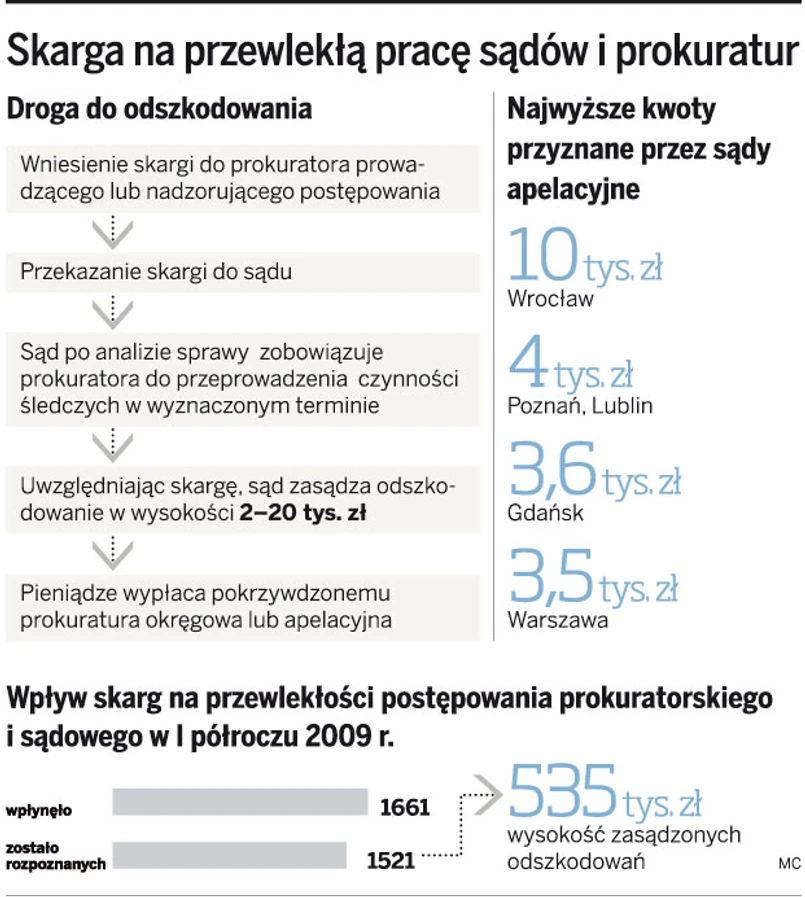 Do sądów trafia coraz więcej skarg na opieszałą pracę sądów i prokuratorów. Coraz wyższe są też odszkodowania. Sąd Apelacyjny we Wrocławiu za przewlekanie postępowania przygotowawczego przyznał ostatnio pokrzywdzonemu rekompensatę w wysokości 10 tys. zł.