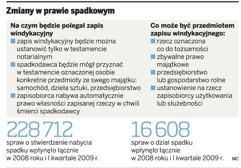 Spadkodawca będzie mógł w testamencie notarialnym ustanowić zapis windykacyjny – przewiduje przygotowany w Ministerstwie Sprawiedliwości projekt nowelizacji kodeksu cywilnego. Wskaże w nim osobę, która z chwilą otwarcia spadku nabędzie przykładowo jego samochód, dzieło sztuki, przedsiębiorstwo lub gospodarstwo, a także zbywalne prawo majątkowe. Przedmiotem zapisu windykacyjnego może być również ustanowienie na rzecz zapisobiorcy użytkowania lub służebności.