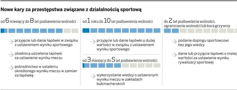 Za wcześniejsze ustalenie wyniku meczu czy walki bokserskiej będzie można trafić do więzienia na okres od sześciu miesięcy do ośmiu lat. Jeżeli w takiej sytuacji łapówka będzie miała dużą wartość, to maksymalny wymiar kary pozbawienia wolności wyniesie dziesięć lat. Surowsze kary dla osób dopuszczających się korupcji mają pojawić się w kodeksie karnym po uchwaleniu nowej ustawy o sporcie. Teraz jej projekt czeka na pierwsze czytanie w Sejmie.