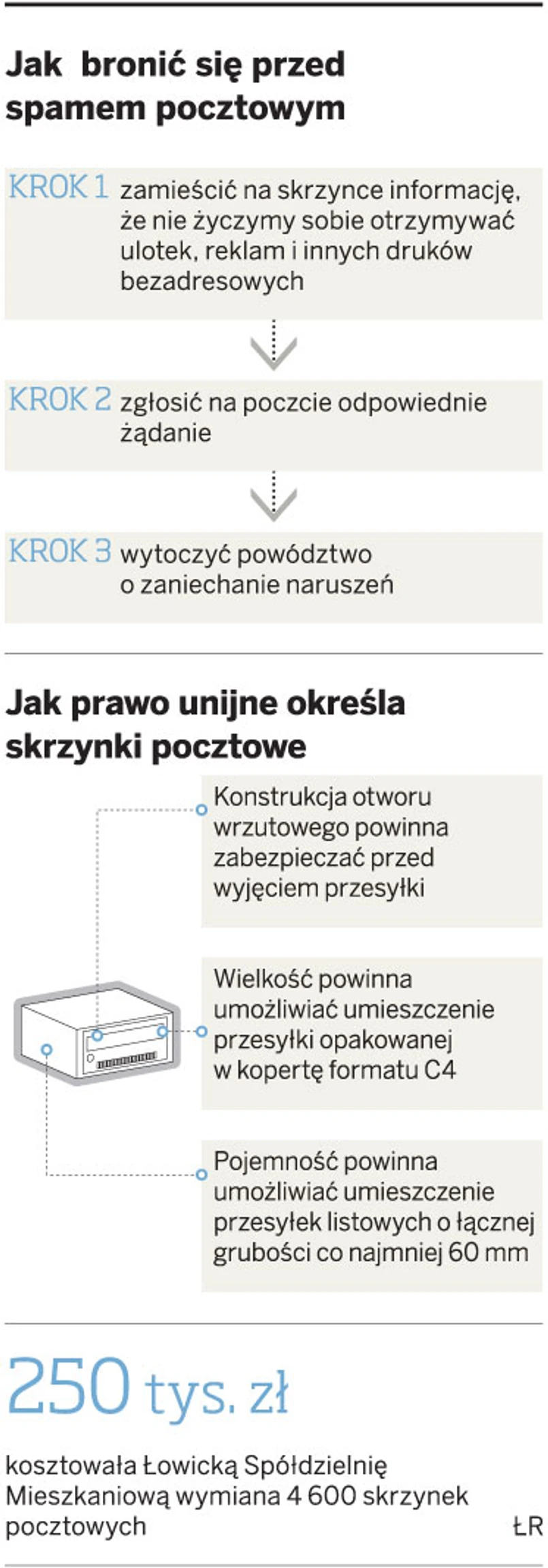 – Ustawodawca nałożył na właścicieli budynków obowiązek zainstalowania pocztowych skrzynek oddawczych spełniających wymagania Europejskiego Komitetu Normalizacji. Przepisy zastrzegły pięcioletni termin na wymianę skrzynek starego typu, do których klucz miał i listonosz, i adresat przesyłek – tłumaczy Agnieszka Traczyk z kancelarii Gregorowicz-Ziemba, Krakowiak, Gąsiorowski.