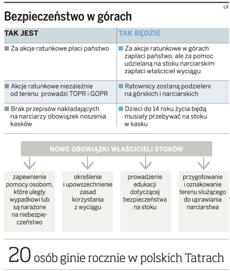 Ratownictwo górskie zostanie oddzielone od ratownictwa narciarskiego. Autorzy projektu zrezygnowali z wprowadzenia obowiązkowego ubezpieczenia dla turystów. W razie wypadku właściciel wyciągu będzie musiał zapewnić narciarzom pomoc.