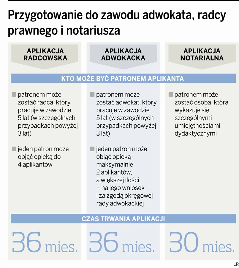 Według danych Ministerstwa Sprawiedliwości na aplikację adwokacką zdało w tym roku ponad 76 proc. osób, tyle samo na radcowską, a na notarialną – ponad 74,5 proc. Tak duża liczba przyjętych na aplikację powoduje, że bardzo trudno znaleźć im patrona.