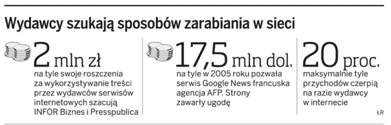 Działania wydawców na drodze prawnej to także kolejny sposób poszukiwania pieniędzy w sieci. Dziś przychody z tego źródła, głównie z reklamy internetowej, nie przekraczają bowiem 15–20 proc. przychodów.