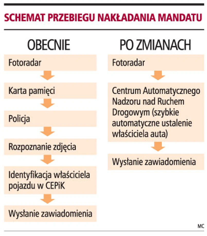 Automatyczny system kontroli ruchu drogowego ma być znacznie wydajniejszy. W chwilę po tym, jak kierowca przekroczy prędkość, zostanie on zidentyfikowany. Zdjęcie trafi do centrum. Jego pracownicy będą mieli dostęp do bazy danych Centralnej Ewidencji Pojazdów i Kierowców. Po rozpoznaniu sprawcy zostanie mu doręczone wezwanie do zapłaty mandatu. Kierowca będzie miał na to 30 dni. Jeżeli w tym czasie nie zapłaci, kara zostanie podwojona.