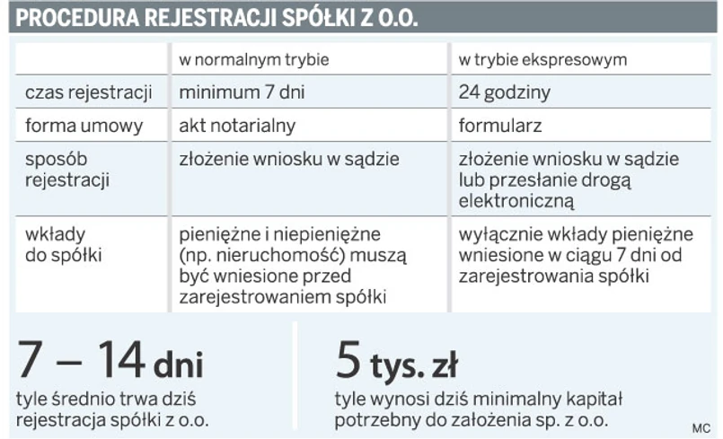 Teraz wniosek o zarejestrowanie spółki składa się w sądzie, a sama rejestracja trwa średnio od 7 do 14 dni. Czas ten może się jednak wydłużyć, jeśli we wniosku znalazły się jakieś błędy. Po wejściu projektu w życie spółkę z o.o. będzie można zarejestrować w trybie ekspresowym, składając w sądzie formularz lub przesyłając go drogą elektroniczną. Z elektronicznej formy skorzystają osoby posiadające kwalifikowany podpis elektroniczny lub notariusze, radcowie prawni i adwokaci – wykorzystujący podpis stosowany w elektronicznym postępowaniu upominawczym.