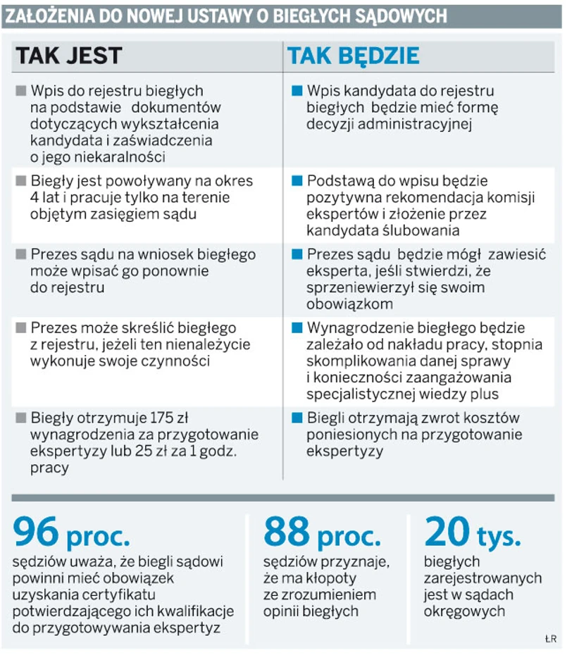 Zmiana przepisów to odpowiedź na krytyczne opinie o pracy biegłych, które napływają do resortu. Prezesi sądów okręgowych zawieszą w funkcji biegłych, którzy sprzeniewierzą się obowiązkom. Wynagrodzenie za ekspertyzę będzie zależało od nakładu pracy, wiedzy i umiejętności.