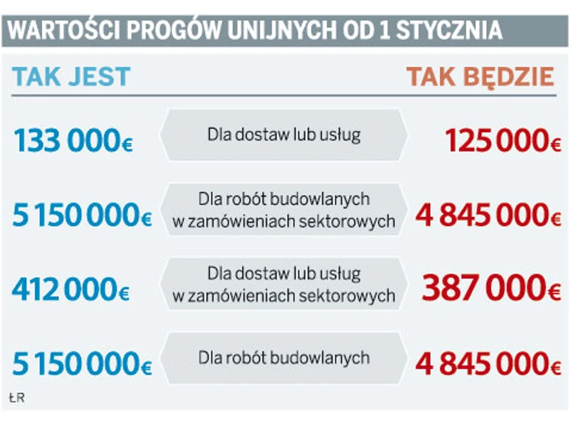 Dla krajowych zamawiających i wykonawców w praktyce najistotniejsze były dwa dotychczasowe progi w wysokości 133 tys. euro dla dostaw lub usług i 5,15 mln euro dla robót budowlanych. Od nowego roku wyniosą one odpowiednio 125 tys. euro i 4,845 mln euro.