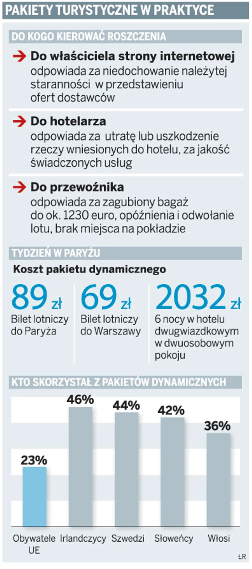 Właściciele stron internetowych, na których można utworzyć pakiet, nie ponoszą jednak odpowiedzialności, jeśli lot zostanie odwołany, opis hotelu podanego w ofercie będzie odbiegał od rzeczywistości, a wynajęty samochód okaże się niesprawny. O tym, że ani prawo krajowe, ani przepisy unijne nie gwarantują turystom ochrony, wie niespełna połowa konsumentów wykupujących pakiety.