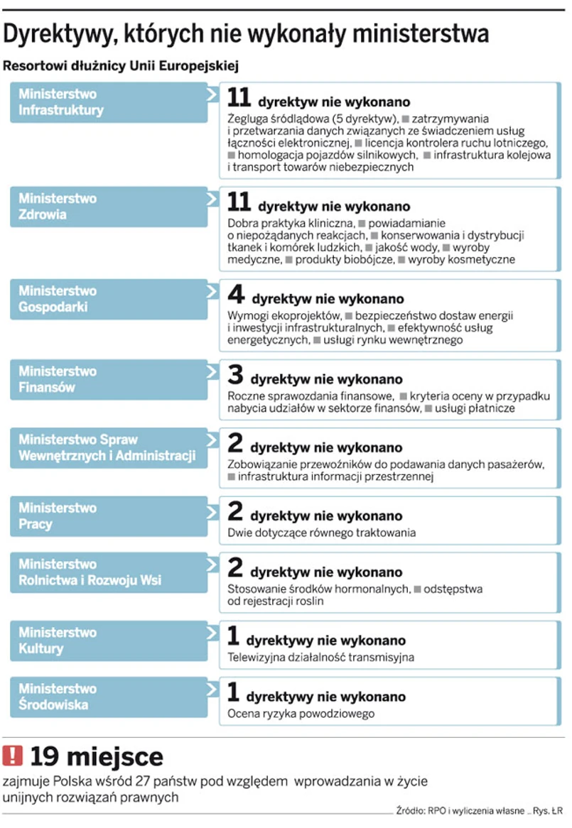 Ministerstwo Infrastruktury nie wprowadziło 11 dyrektyw. Dotyczą one przetwarzania danych związanych ze świadczeniem usług łączności elektronicznej, w sprawie licencji kontrolera ruchu lotniczego, pięć dyrektyw w sprawie żeglugi śródlądowej, homologacji pojazdów silnikowych, infrastruktury kolejowej i transportu towarów niebezpiecznych.