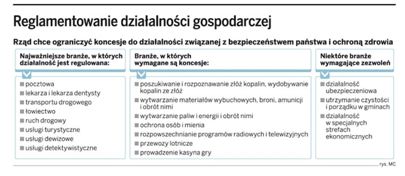 Ministerstwo Gospodarki chce w istotny sposób ograniczyć reglamentację działalności gospodarczej i zrezygnować w wielu branżach z ubiegania się przez przedsiębiorców z obowiązku wpisywania się do rejestru działalności regulowanej. Teraz w 28 branżach, aby założyć firmę, trzeba wpis uzyskać. Obowiązek uzyskania koncesji istniałby w branżach związanych z ochroną zdrowia, życia, porządku publicznego i bezpieczeństwa kraju.