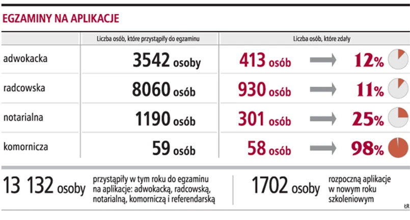 Słaby wynik egzaminów na aplikacje w Warszawie nie jest wyjątkiem. W całym kraju spośród 13 tys. 132 osób, które zdawały egzamin na aplikację adwokacką, radcowską, notarialną i komorniczą, jedynie 1702 osoby rozpoczną szkolenie, co stanowi zaledwie 13 proc. wszystkich zdających. Najwięcej osób będzie się kształciło w zawodzie radcy prawnego - 930 osób (11,5 proc. ogólnej liczby zdających) i adwokata - 413 (11,7 proc. ogólnej liczby zdających). Duże lepsze wyniki uzyskali w tym roku kandydaci na aplikację notarialną - 301 osób przyjętych (25,3 proc. ogólnej liczby zdających) i komorniczą - 58 osób przyjętych spośród 59 zdających.