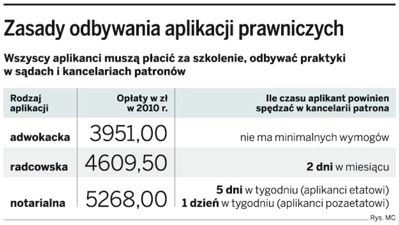 Najdroższa jest aplikacja notarialna – opłata roczna wynosi w tym przypadku 5268 zł. Taką opłatę muszą uiszczać także aplikanci, którzy nie znaleźli patrona, a więc nie mogą uczęszczać na zajęcia teoretyczne, ale rozpoczęli praktyki w sądach. Opłata roczna za aplikację radcowską wynosi 4609,50 zł, a za aplikację adwokacką – 3951 zł. Większość samorządów prawniczych dopuszcza możliwość zwolnienia aplikanta od ponoszenia opłaty za aplikację w całości lub w części, a także odroczenia jej płatności lub rozłożenia jej na raty. Wśród aplikantów pojawiają się też niepokojące sygnały.