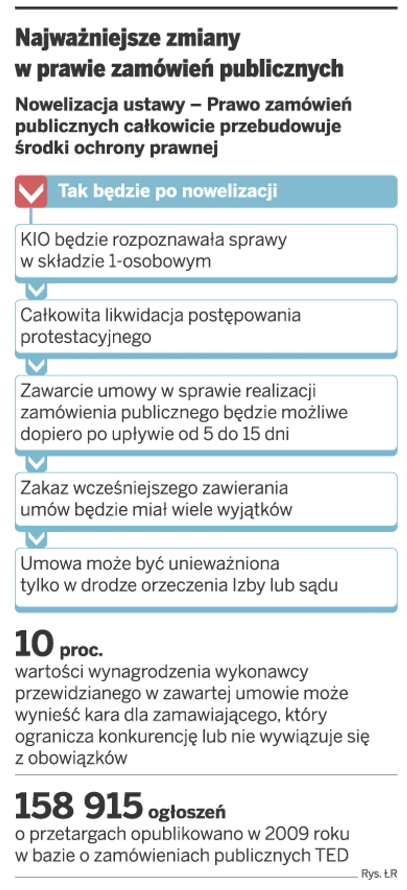 nowelizacja wywoła zwiększoną liczbę odwołań. Przyczyną nie będzie jednak zmiana sposobu wnoszenia odwołań, ale likwidacja instytucji protestu. Nowela zakłada całkowitą likwidację postępowania protestacyjnego. Przewiduje jedynie odwołanie, które przysługuje w dwóch przypadkach: gdy w postępowaniu o udzielenia zamówienia zamawiający podejmie czynności niezgodne z przepisami oraz w razie zaniechania czynności, do której zamawiający jest ustawowo zobowiązany.