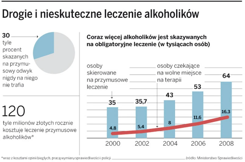 Dziś o tym, kogo wysłać na przymusowy odwyk, decyduje sąd – albo na wniosek prokuratury, albo gminnej komisji rozwiązywania problemów alkoholowych. Na takie leczenie można skierować alkoholików, którzy „systematycznie zakłócają spokój lub porządek publiczny, demoralizują małoletnich lub powodują rozkład życia rodzinnego”. A że często właśnie wyrok sądowy jest jedyną metodą skłonienia takich osób do leczenia, liczba wyroków z roku na rok gwałtownie rośnie. O ile jeszcze w 2004 roku na przymusowy odwyk skazano 43 tys. osób, to w 2008 roku było ich już ponad 64 tys. – Niestety rośnie też liczba osób, które, choć skazane na leczenie, nigdy na nie trafiają – mówi Krzysztof Brzózka, szef Państwowej Agencji Rozwiązywania Problemów Alkoholowych.