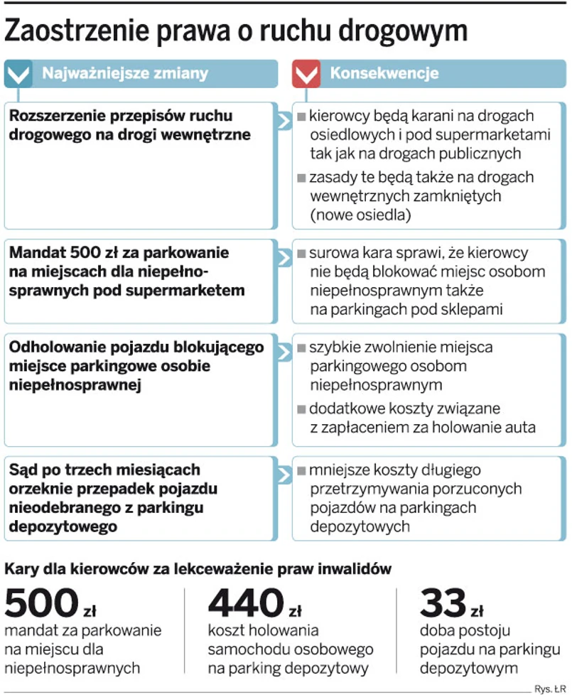 Obecnie za zajmowanie miejsca dla inwalidów już grozi mandat w wysokości 500 zł. Jednak kara taka jest stosowana tylko na drogach publicznych. Policja i straż miejska nic nie mogą zrobić, gdy kierowcy zajmują miejsca dla niepełnosprawnych na parkingach pod supermarketami. Funkcjonariusze ochrony próbują interweniować, ale kończy się to jedynie zwróceniem uwagi. Nowe przepisy to zmienią. Kierowca taki dostanie mandat, ale dodatkowo musi się liczyć z tym, że jego auto zostanie odholowane na parking policyjny.