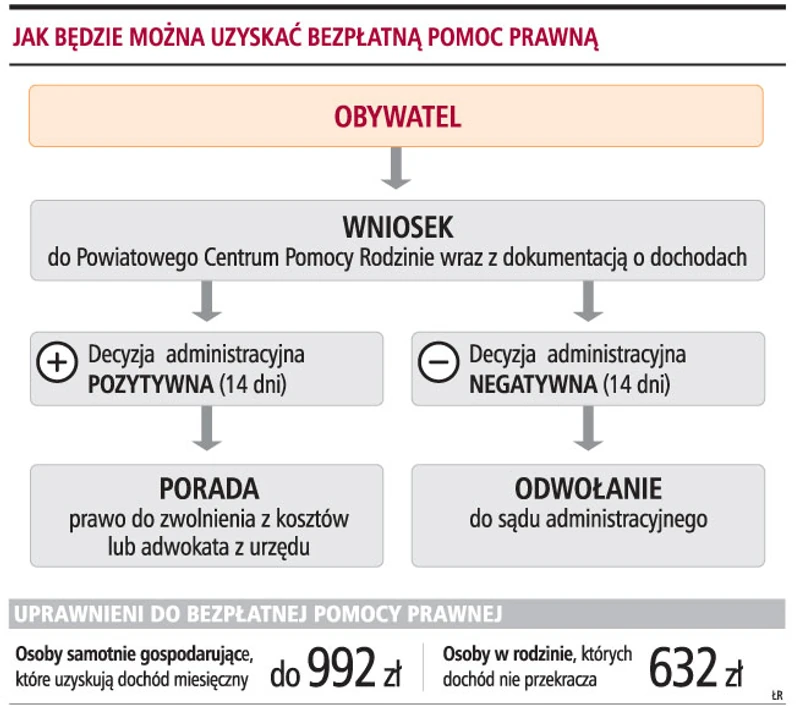 O przyznaniu adwokata z urzędu będą decydować powiatowe centra pomocy rodzinie. Kryteria dochodowe zadecydują o prawie do otrzymania pomocy prawnej i zwolnienia z kosztów sądowych. Powiatowe centra pomocy rodzinie powinny otrzymać środki na finansowanie usługi adwokata lub radcy prawnego.