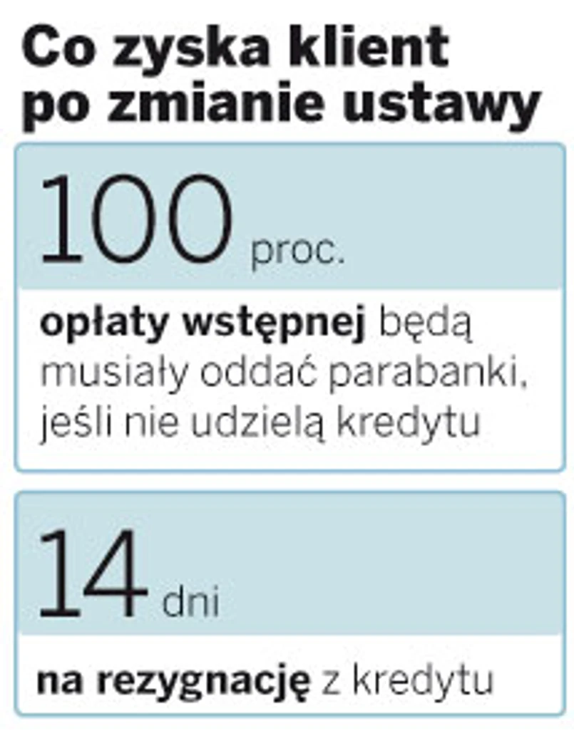 Oszukiwanie klientów może wyeliminować nowelizacja ustawy o kredycie konsumenckim, która będzie nakazywać zwrot opłaty przygotowawczej, jeżeli nie dojdzie do udzielenia pożyczki. Taki projekt przygotowuje Rządowe Centrum Legislacji we współpracy z Urzędem Ochrony Konkurencji i Konsumentów. Nowe prawo ma zacząć obowiązywać już w tym roku.