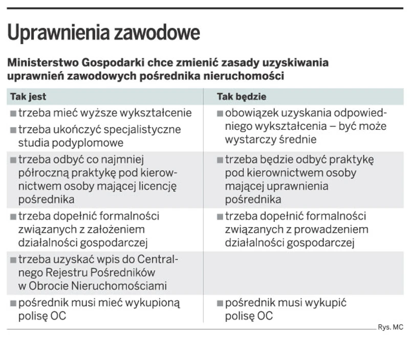 Ministerstwo Gospodarki chce znieść obowiązek uzyskiwania licencji pośrednika nieruchomości. Przedsiębiorcy łatwiej założą firmę i uzyskają dostęp do reglamentowanej obecnie branży. Organizacje skupiające pośredników twierdzą, że może to doprowadzić do likwidacji zawodu.