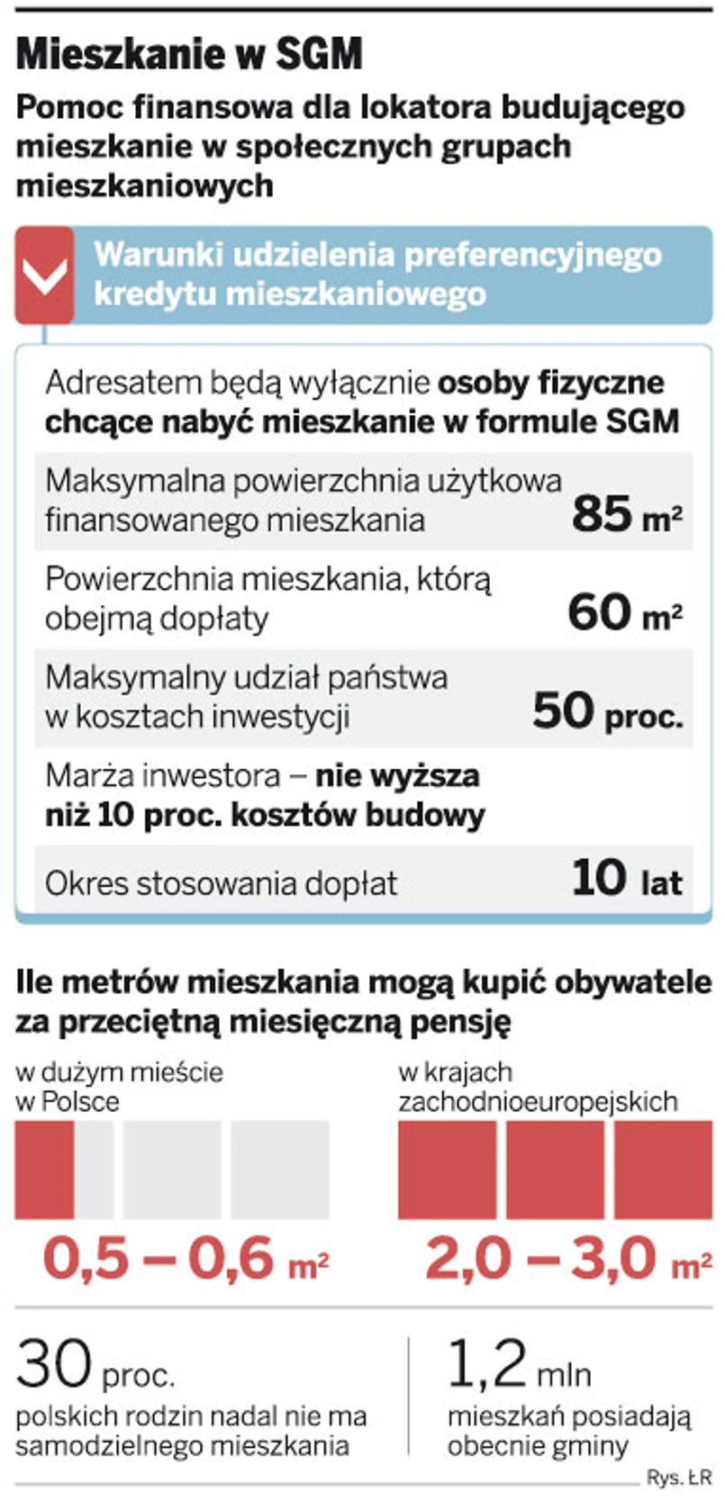 Gminy będą tworzyć mieszkania społeczne pod wynajem, a społeczne grupy mieszkaniowe (SGM) zajmą się budowaniem i wyodrębnianiem lokali, które będą wynajmowane, a następnie przenoszone na własność najemców. Powstanie nowych form budownictwa mieszkań dla osób o niskich i średnich dochodach zaproponowało Ministerstwo Infrastruktury w oddanym do konsultacji społecznych projekcie założeń do nowej ustawy o społecznym zasobie mieszkań czynszowych i społecznych grupach mieszkaniowych.