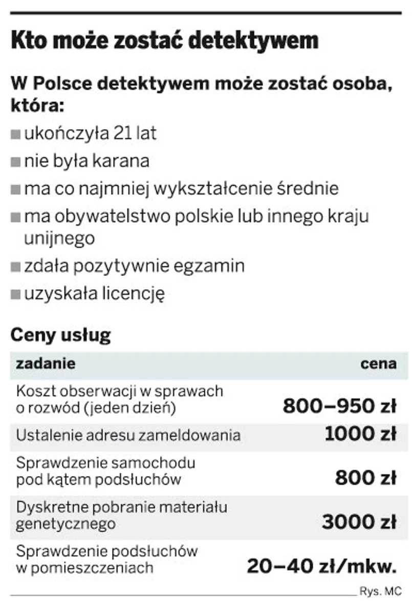 – Możemy jedynie grzecznie prosić o udzielenie nam informacji dotyczących na przykład miejsca zameldowania osoby, której poszukujemy lub którą jesteśmy zainteresowani – mówi Michał Rapacki z Biura Detektywistycznego Rapacki. Dodaje, że te wszystkie braki powodują, że zawód ten jest stawiany na granicy legalności.