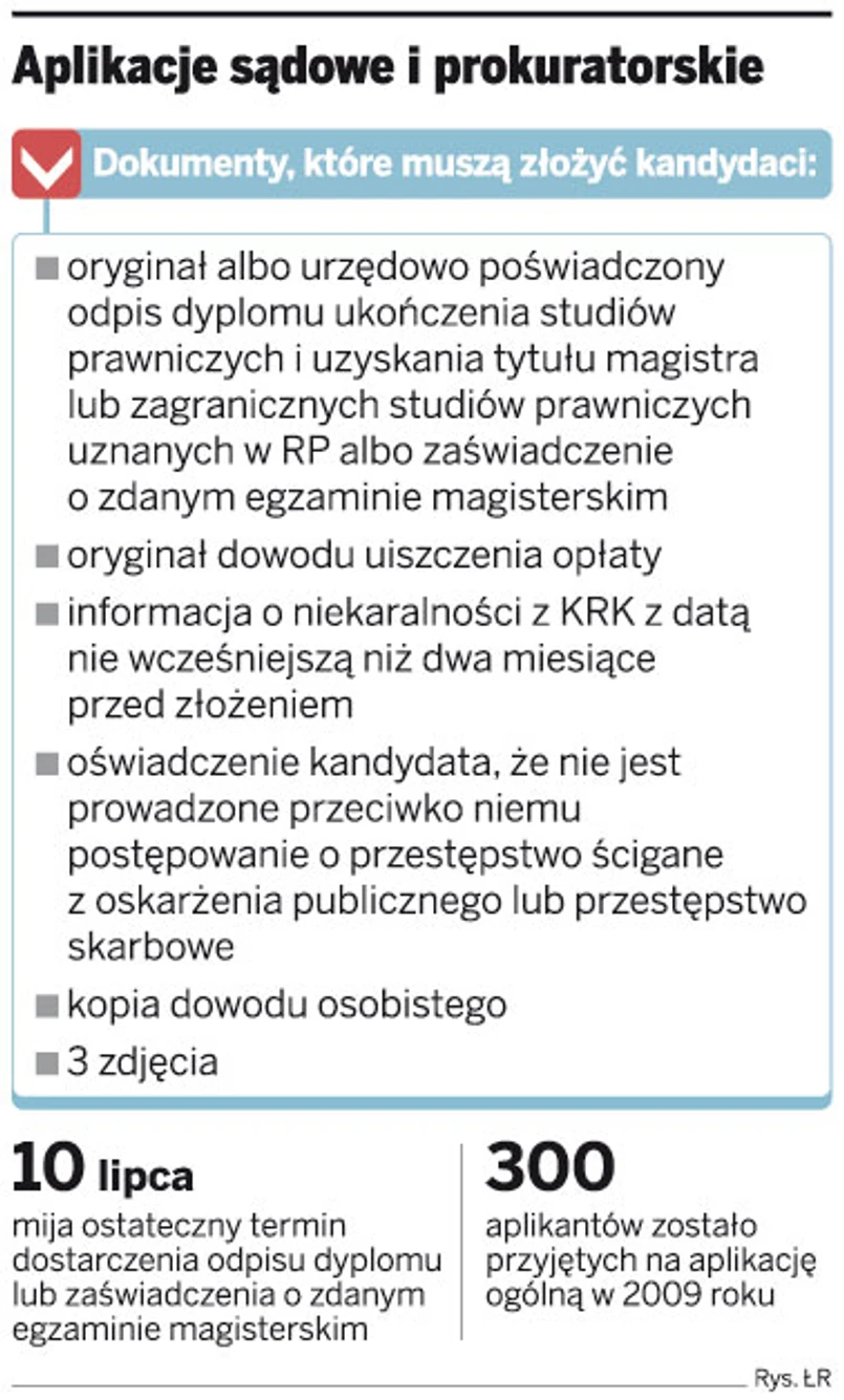 – Kandydat powinien dołączyć oryginał albo urzędowo poświadczony odpis dyplomu ukończenia wyższych studiów prawniczych i uzyskania tytułu zawodowego magistra lub zagranicznych studiów prawniczych uznanych w RP albo zaświadczenia o zdanym egzaminie magisterskim – tłumaczy Joanna Dębek z Ministerstwa Sprawiedliwości.