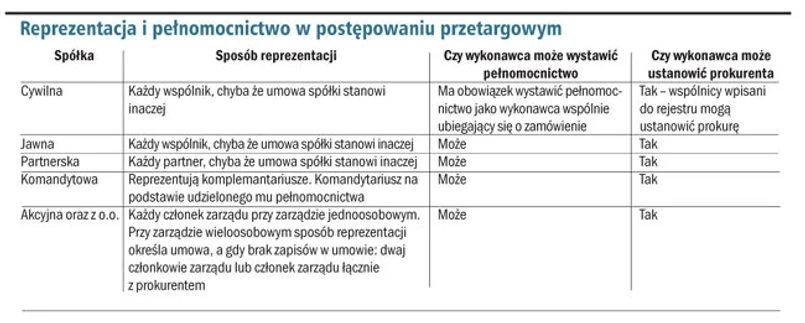 Do reprezentacji spółki cywilnej uprawniony jest każdy wspólnik, jeżeli umowa spółki nie stanowi inaczej. W prawie zamówień publicznych spółka cywilna jest traktowana jako podmiot utworzony przez wykonawców wspólnie ubiegających się o zamówienie. W związku z tym mają oni obowiązek do ofert załączyć pełnomocnictwo. Niedostarczenie pełnomocnictwa powodować będzie obowiązek odrzucenia oferty. Fakt udzielenia pełnomocnictwa nie musi wynikać z dokumentu o nazwie pełnomocnictwo czy upoważnienie. Takie umocowanie może być zawarte również w innym dokumencie. Stanowiska wyrażane w doktrynie wskazują na to, że wspólnicy spółki cywilnej mają obowiązek wystawić pełnomocnictwo do ich reprezentacji jako wykonawców, ale nic nie stoi na przeszkodzie, by ustanowiona została prokura.