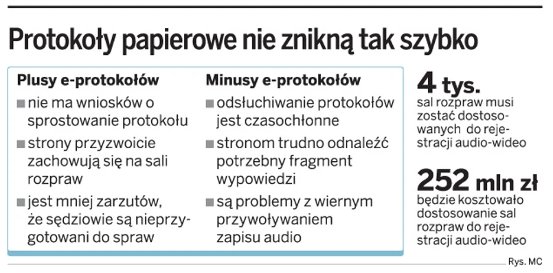 Zgodnie z nowymi przepisami zasadą ma być protokołowanie spraw cywilnych w formie elektronicznej. Zachowano jednak furtkę: protokół pisemny będzie spisany zgodnie z dotychczasową praktyką wtedy, gdy rejestracja dźwięku albo obrazu będzie niemożliwa z przyczyn technicznych, czyli tak naprawdę na większości sal sądowych w Polsce.