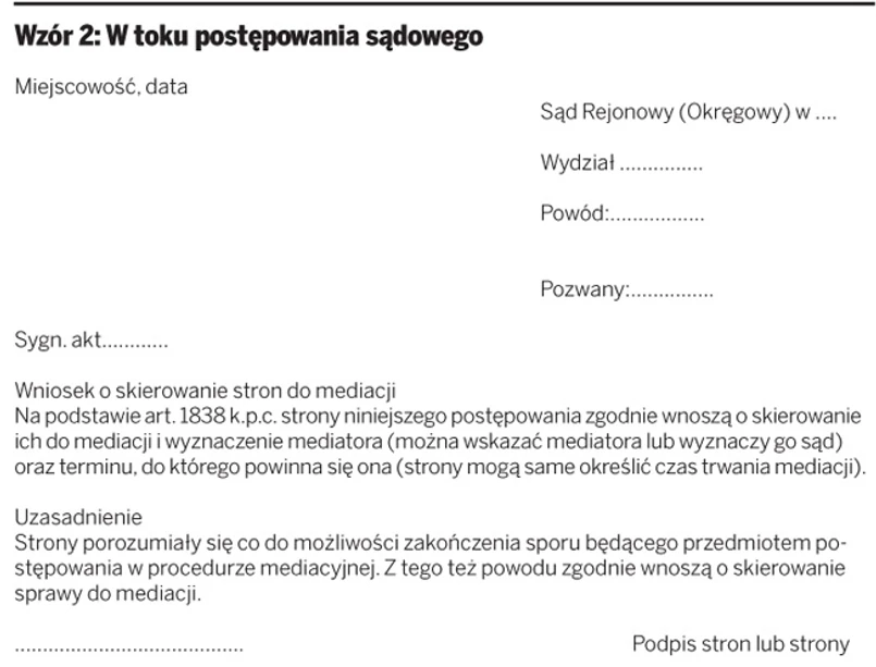 Dopuszczalny jest nawet sposób dorozumiany (kodeks postępowania cywilnego nie narzuca w tej kwestii żadnej formy). Oznacza to, że wystarczy zgodne przystąpienie do mediacji. Niemniej nawet podpisanie umowy mediacyjnej nie wyklucza rozpoznania sprawy przez sąd, tyle że pozwany mógłby w takiej sytuacji podnieść zarzut, że została ona zawarta. I jeśli strona sporu mimo umowy bezzasadnie odmówi udziału w mediacji, to musi się liczyć z koniecznością poniesienia kosztów procesu.