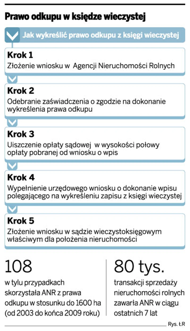 Właściciele zakupionych od Agencji Nieruchomości Rolnych ziem mają problem z wykreśleniem z ksiąg wieczystych wpisu o przysługującym Agencji prawie odkupu tych nieruchomości w ciągu 5 lat od ich sprzedaży. Tymczasem przepisy, w oparciu o które takie zastrzeżenie było wpisywane do działu III ksiąg wieczystych, utraciły moc z dniem wejścia w życie wyroku Trybunału Konstytucyjnego uznającego je za niekonstytucyjne, tj. 29 marca 2010 r.