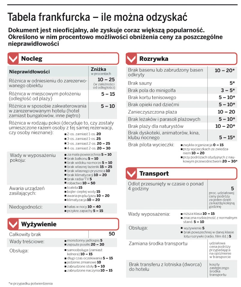 Zamiast apartamentu z tarasem i widoku na morze ciasny pokoik z okienkiem wychodzącym na śmietnik. Zamiast wyjścia z bungalowu bezpośrednio na piaszczystą plażę – trzykilometrowy spacer, by rozłożyć ręcznik na kamienistym brzegu. Co roku kilka tysięcy Polaków – eksperci szacują ich liczbę od pięciu tysięcy w górę – skarży biura podróży. Większość spraw załatwiana jest polubownie przed rozprawą w sądzie. A wszystko dzięki tzw. tabeli frankfurckiej, przekornie czasem nazywanej biblią niezadowolonych turystów.