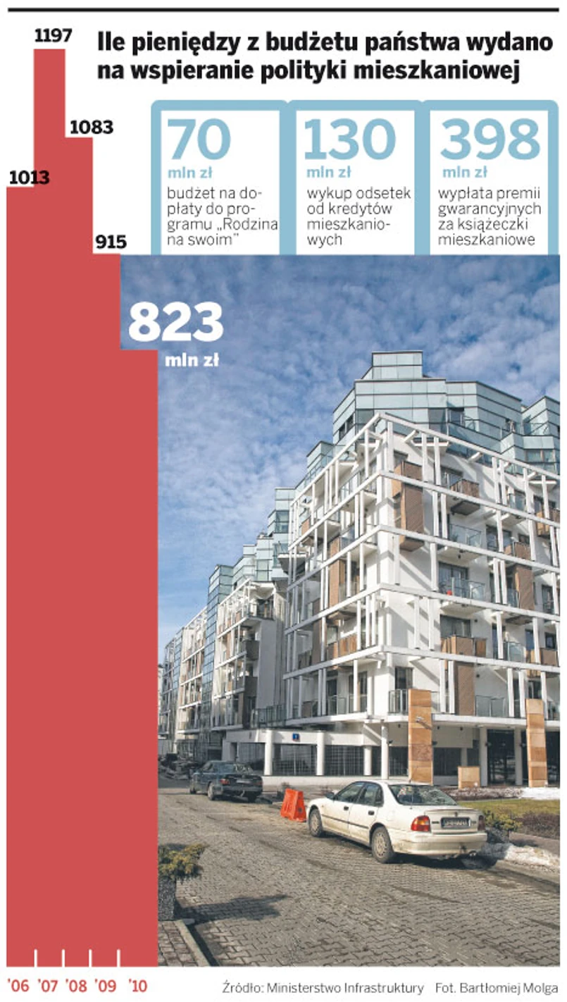W ciągu ostatnich pięciu lat państwo wyłożyło na programy wpierania budownictwa mieszkaniowego ponad 5,5 mld zł. Wiele z tych pieniędzy nie trafiło do najbardziej potrzebujących. Np. na wynajem mieszkań w Towarzystwach Budownictwa Społecznego (tutaj dopłacano do ich budowy ok. 15 proc.) stać dziś głównie bogatych, bo czynsze są tam niewiele niższe niż na wolnym rynku.
