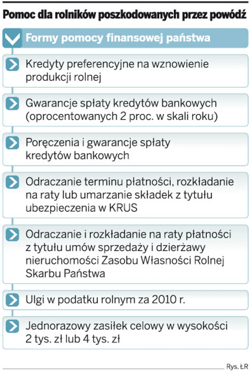 Producenci rolni, którzy ucierpieli w tegorocznej powodzi, otrzymają dopłaty od Agencji Rynku Rolnego (ARR), jeśli jesienią 2010 r. oraz wiosną 2011 r. zakupią i zużyją do siewu materiał siewny kategorii elitarny lub kwalifikowany. Przewiduje to przygotowany przez Ministerstwo Rolnictwa projekt nowelizacji ustawy o ARR i organizacji niektórych rynków rolnych, która umożliwi wykonanie pomocy przewidzianej w rządowym programie dla rodzin rolniczych, w których gospodarstwach rolnych powstały szkody. Nowy rodzaj pomocy ma kosztować państwo 10 mln zł jesienią 2010 roku oraz 10 mln zł wiosną 2011 roku, przy założeniu, że w każdym z tych okresów pomocą w wysokości 100 zł za 1 hektar objętych będzie 100 tys. ha.