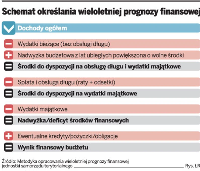 Metodyka opracowania prognozy określa, jakie powinny być jej etapy opracowania. Pierwszym krokiem jest oszacowanie dochodów ogółem (własnych i transferów zewnętrznych) jednostki, a następnie porównanie ich z wydatkami bieżącymi, które są niezbędne do funkcjonowania jednostki. Jak wynika z metodyki, na tym etapie należy pominąć wydatki na obsługę długu. Następnie należy obliczyć różnicę między dochodami ogółem i wydatkami bieżącymi powiększonymi o kwoty przychodu z nadwyżki budżetowej z roku poprzedniego i wolne środki. Tak obliczona różnica stanowi pulę środków, które można rozdysponować na dwa cele: spłatę i obsługę długu oraz inwestycje (istotne jest zachowanie tej kolejności). Jak wyjaśniają autorzy dokumentu, im więcej środków jednostka przeznacza na spłatę długu i jego obsługę, tym mniej pozostaje na nowe inwestycje.