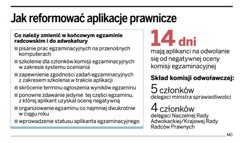 Samorządy prawnicze chcą ponownie organizować egzaminy adwokackie i radcowskie, ponadto przedstawiciele palestry domagają się powrotu do ustnej formy weryfikowania wiedzy. Natomiast w poprawce aplikanci chcą zdawania jedynie tej części sprawdzianu, której nie zaliczyli.