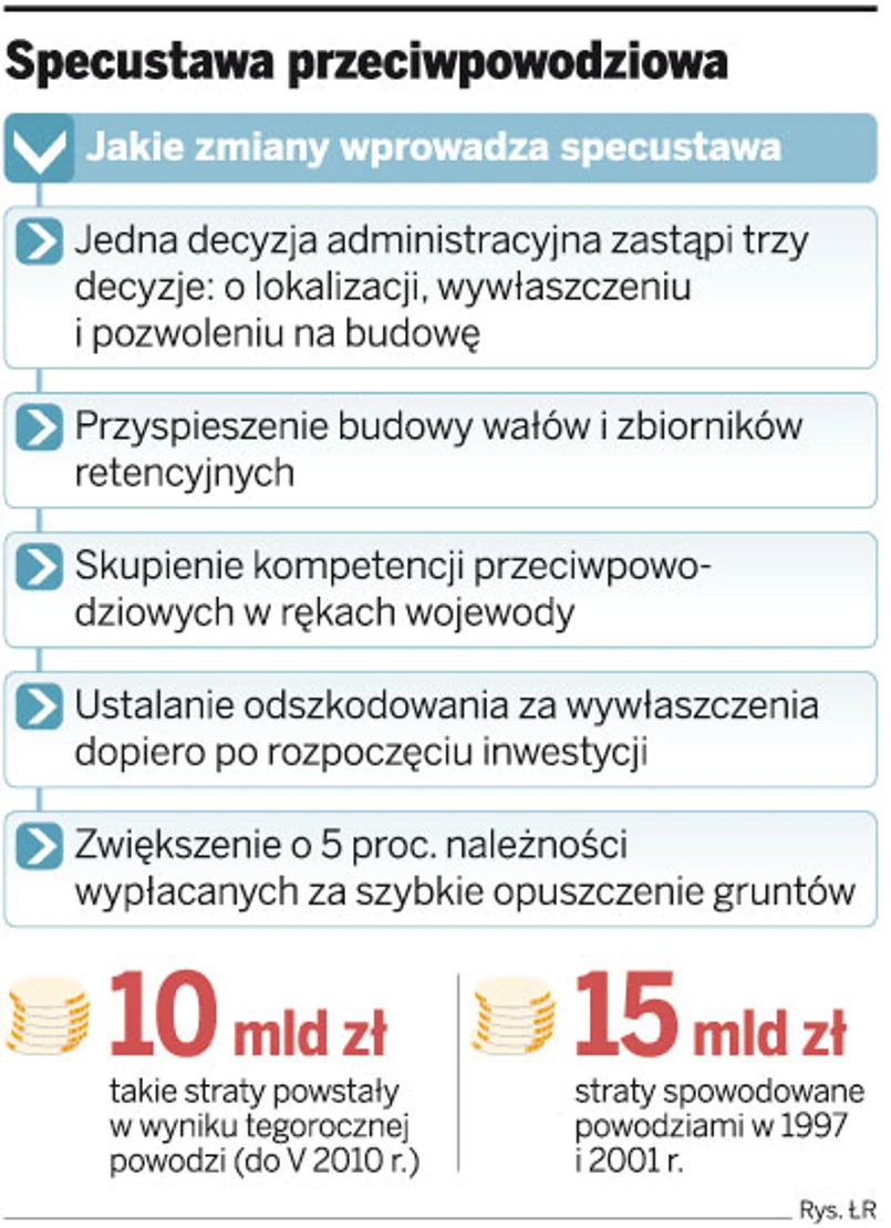 Wojewoda jedną decyzją wskaże, gdzie należy zbudować wały przeciwpowodziowe, wywłaszczy właścicieli gruntów i zatwierdzi projekt budowlany. Tak stanowi nowa ustawa o szczególnych zasadach przygotowania do realizacji inwestycji w zakresie budowli przeciwpowodziowych, która dziś wchodzi w życie. Rozwiązania są wzorowane na specustawie drogowej, w której przypadku decyzje o wywłaszczeniu także podejmują władze województwa. Niemal natychmiast będzie mogła ruszyć inwestycja. Odszkodowanie za grunty, tak jak w przypadku specustawy drogowej, będzie ustalane później w osobnym postępowaniu.