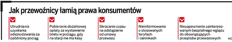 Trudności z uzyskaniem odszkodowania za opóźniony pociąg, ograniczenie prawa do odstąpienia od umowy oraz kłopoty z zakupem biletów na stacjach – to tylko niektóre naruszenia praw konsumentów, jakie w najnowszym raporcie wytknęła przewoźnikom kolejowym prezes Urzędu Ochrony Konkurencji i Konsumentów (UOKiK).