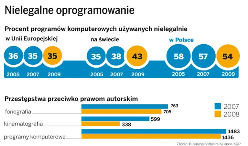 – Szacuje się, że nielegalna jest ponad połowa oprogramowania dostępnego w Polsce – mówi Bartłomiej Witucki z Business Software Alliance, organizacji zajmującej się walką z piractwem komputerowym. Jak obliczył ZPAV, straty firm fonograficznych zrzeszonych w tej organizacji od maja to ponad 3 mln zł. Dystrybutorzy filmowi swoje straty wyceniają na 380 mln zł rocznie.