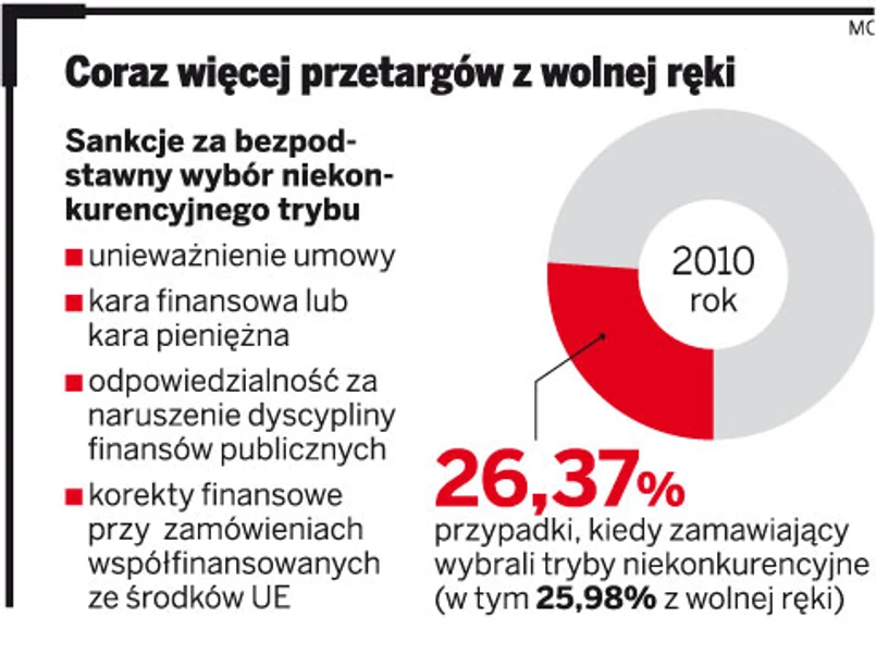 Omijając konkurencyjne procedury, zamawiający wiele ryzykuje. Stosując zamówienie z wolnej ręki, najłatwiej narazić się na zarzut korupcji lub nieprawidłowego wydatkowania środków publicznych. W razie wykrycia nieprawidłowości w grę wchodzi unieważnienie umowy, nałożenie kary pieniężnej oraz korekty finansowe przy zamówieniach współfinansowanych ze środków UE.