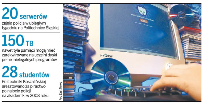 Na śląskiej uczelni policjanci znaleźli 20 nielegalnych serwerów. Obsługiwały one strony, z których można było nielegalnie ściągnąć filmy, gry, muzykę i oprogramowanie, a także szwedzki serwis The Pirate Bay.