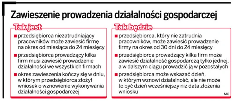 Projekt nie przewiduje natomiast skrócenia okresu, na jaki można zawiesić działalność gospodarczą. Po zmianach nadal będzie to minimum 30 dni.