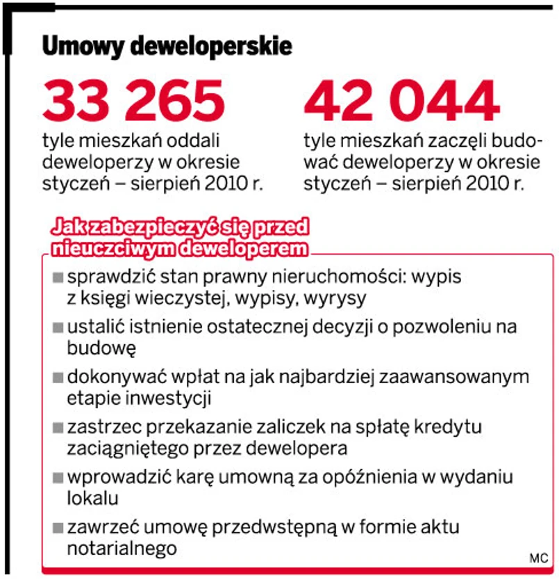 Problemy krakowskiego dewelopera Leopard,który był zadłużony na 140 mln zł, czy też wrocławskiej firmy Architect 21 to tylko niektóre przykłady fali bankructw na rynku nieruchomości, jakie miały miejsce w ciągu ostatniego roku. Kupno mieszkania wiąże się z zadłużeniem na kilkadziesiąt lat. Dlatego też nabywając lokal, należy zwrócić szczególną uwagę na pułapki, które są zastawiane na klientów w umowach deweloperskich. Zazwyczaj ich postanowienia zabezpieczają bowiem wyłącznie interes sprzedającego.